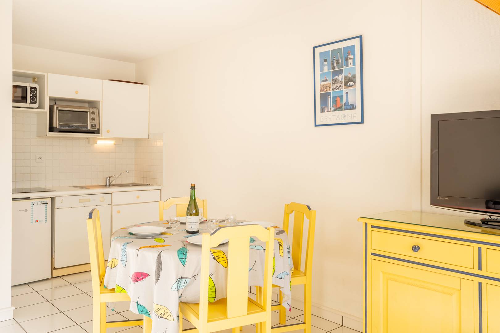 - Coin-cuisine équipé (plaque vitro 4 feux, mini-four, micro ondes, réfrigérateur, lave-vaisselle)