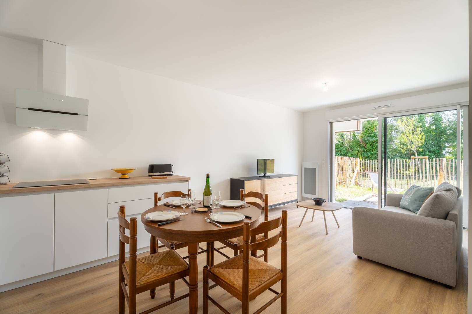 - Séjour avec partie repas (table et chaises) et partie salon (canapé, TV) ouvrant sur la terrasse partiellement couverte exposée Sud (meuble de jardin) et prolongée par le jardinet privatif clos