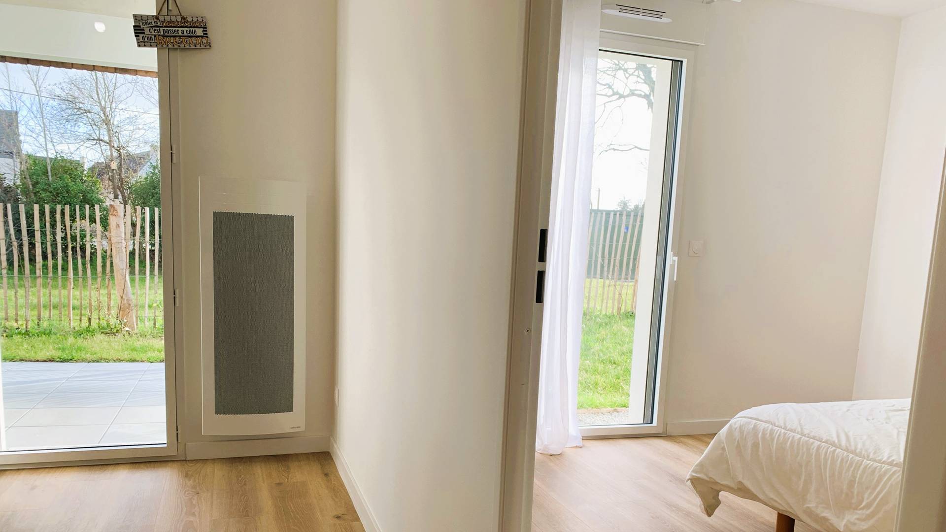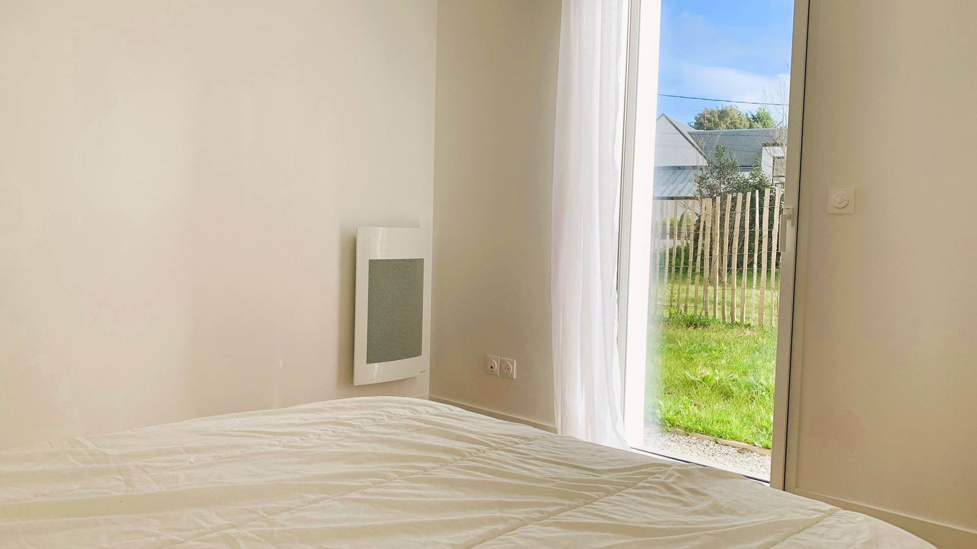 - 1 chambre avec 1 lit double (140, couette) avec accès au jardin