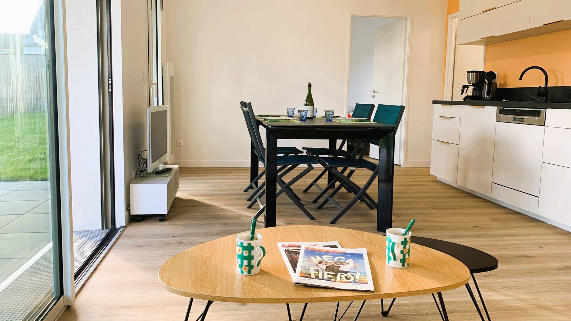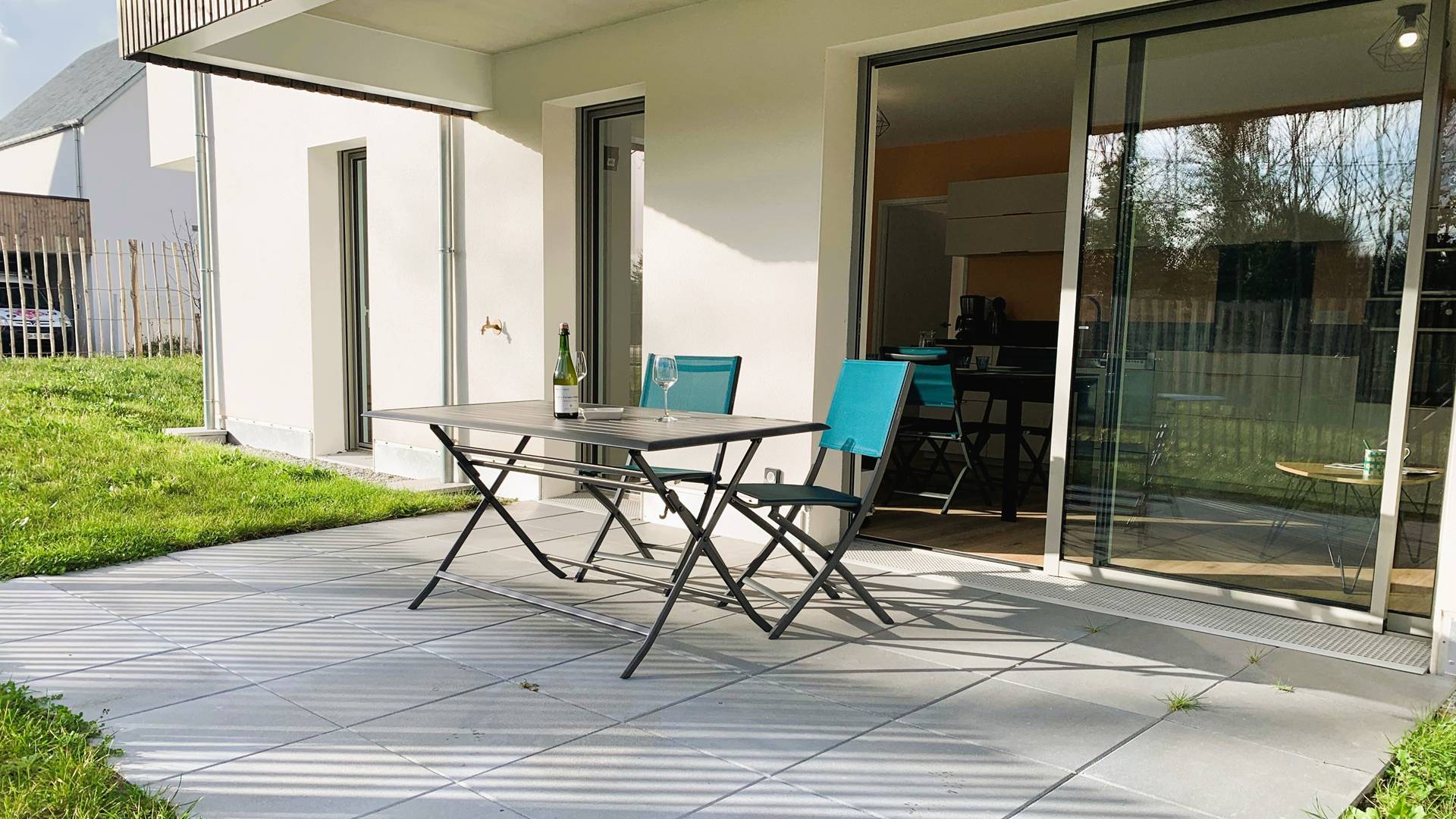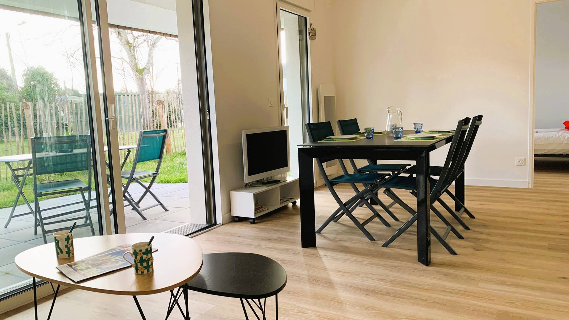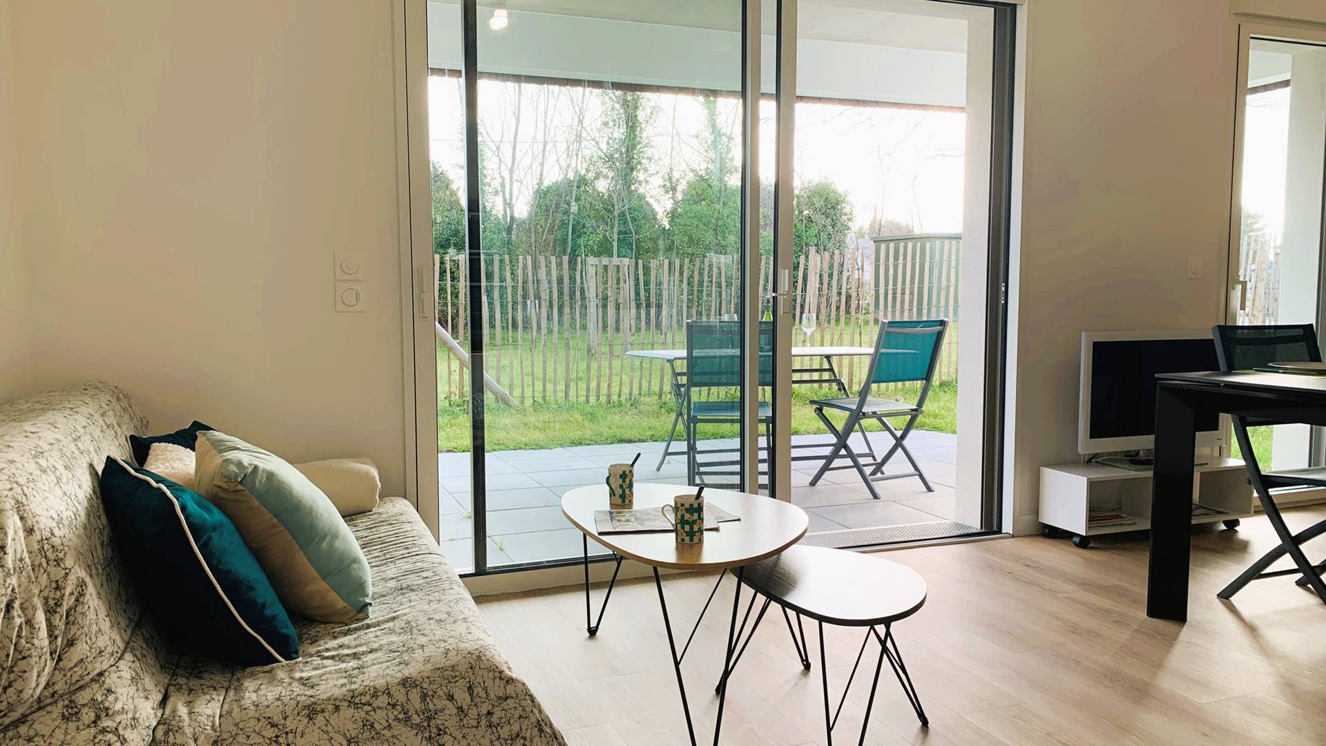 - Séjour avec partie salon (canapé, TV) et partie repas (table et chaises) ouvrant sur la terrasse partiellement couverte exposée Sud (table de jardin, transats) et prolongée par le jardinet privatif clos