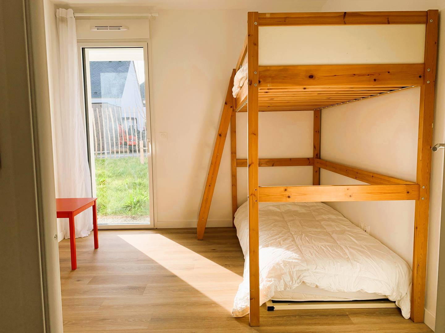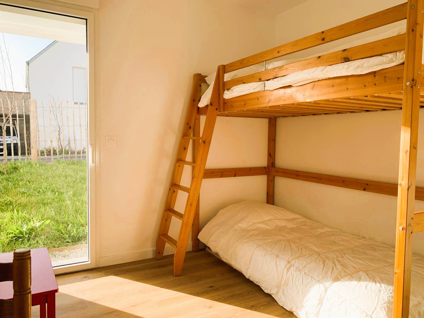 - 1 chambre avec lits superposés (90, couettes) avec accès au jardin