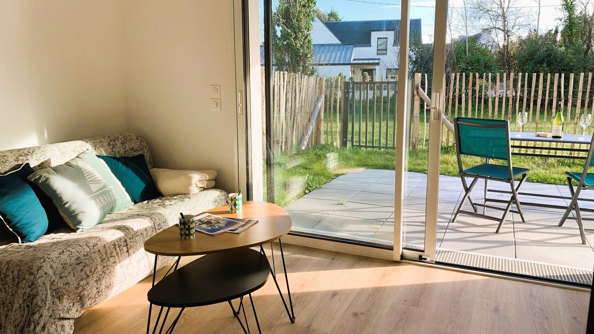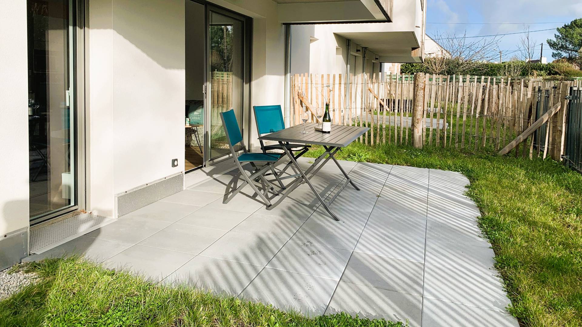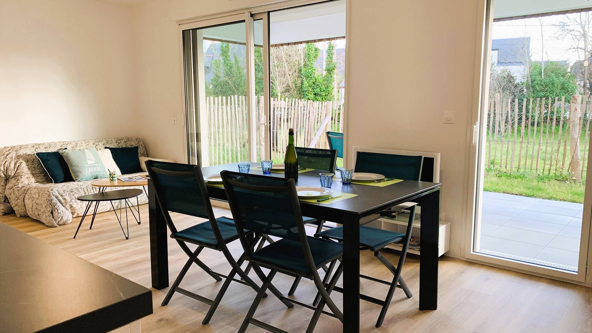 Idéalement situé à mi-chemin entre la plage et le bourg de Carnac, bel appartement 3 pièces pour 4 personnes (env. 58m²), avec grande terrasse et jardin privatif, situé dans la résidence moderne PASSAGE CESARINE (bâtiment A, RDC, porte 4) :