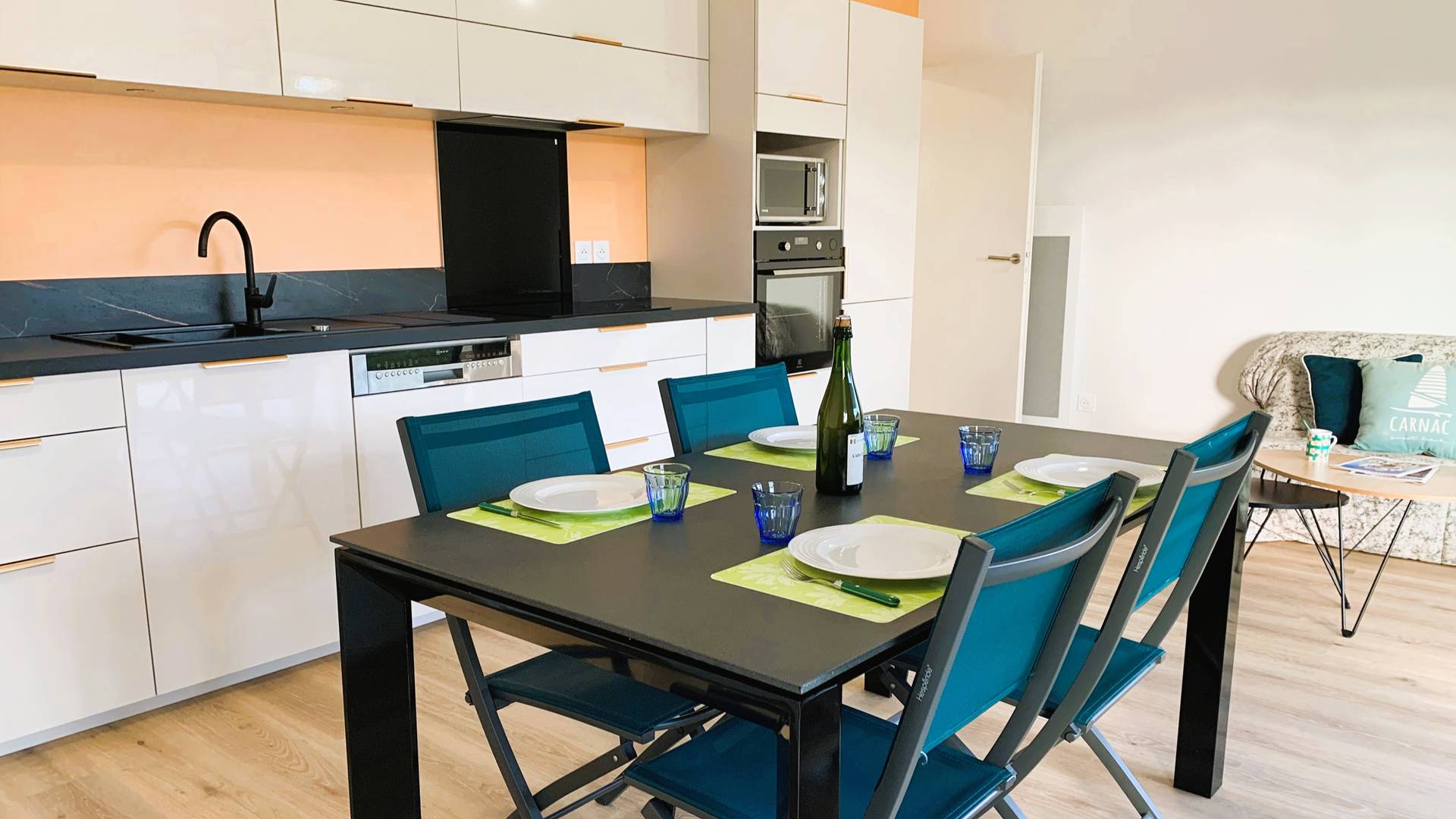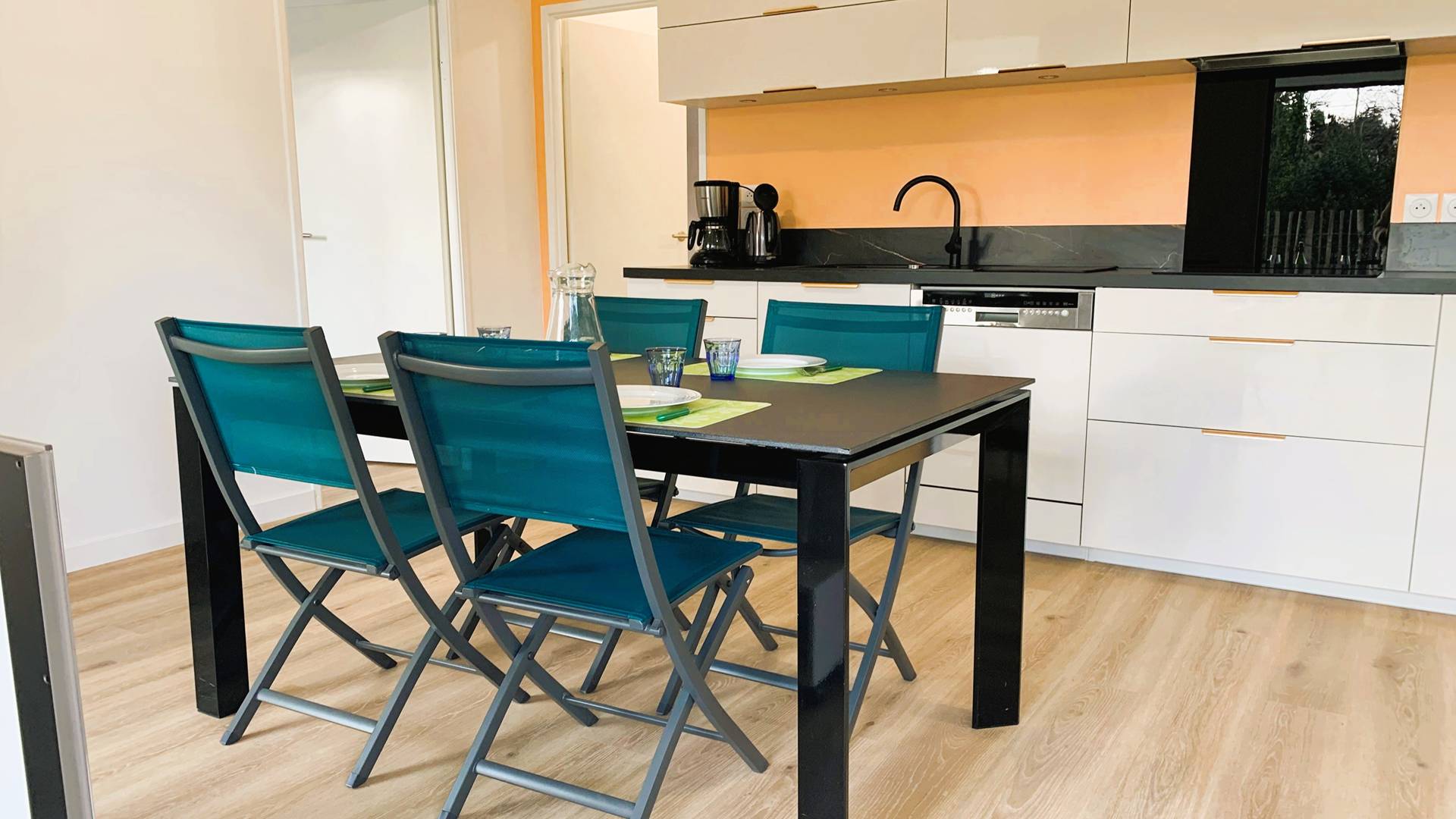 - Grande cuisine ouverte et toute équipée (plaque induction 4 feux, four, micro-ondes, réfrigérateur-congélateur, lave-vaisselle, cafetière, grille-pain, bouilloire)